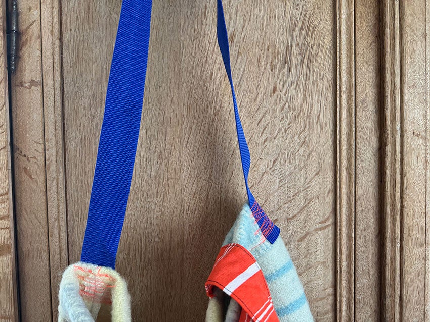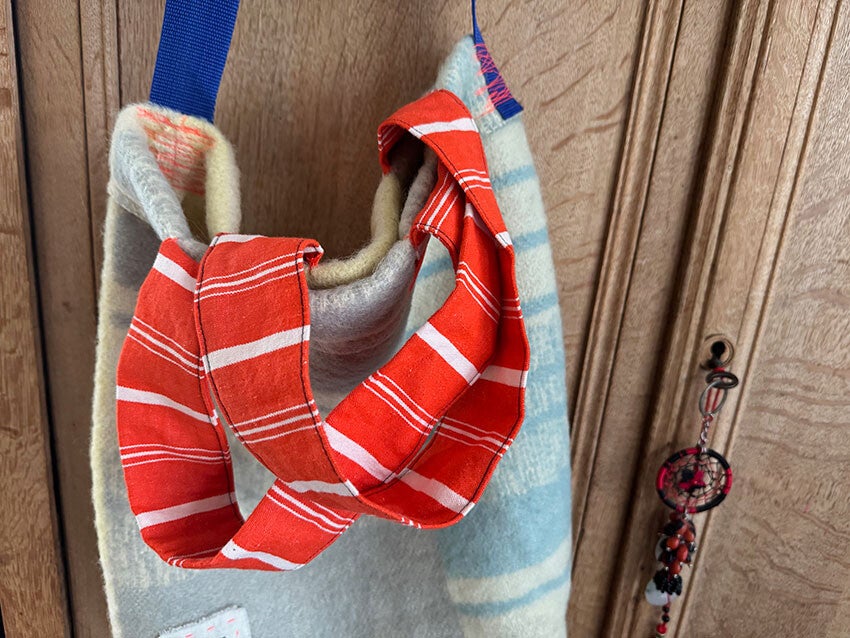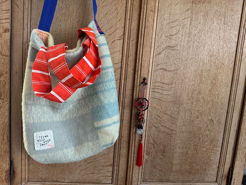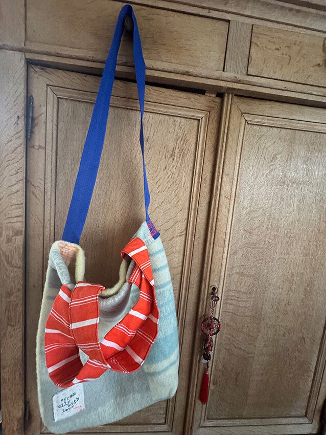 Een prachtige tas van een wollen deken in lichtblauw en lichtgrijs. De tas is niet gevoerd. Er zitten een lange en korte hengsels aan. De korte hengsels zijn van oranje boerenbont, de lange is van blauw tassenband.