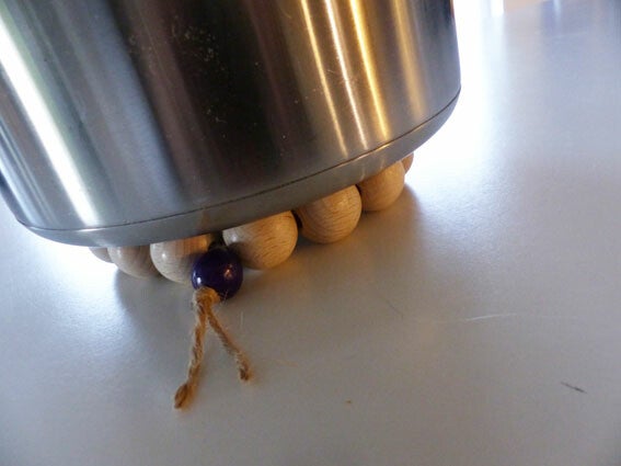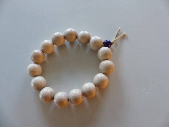Onderzetter van beukenhouten kralen en één paarse kraal. Bij elkaar gehouden door hennep touw. Een sierraad op tafel. Handmade with love.