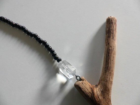 Met een stokje uit de bossen van de Hondsrug heb ik een ketting gemaakt. De kralen zijn van glas. Zwarte kralen en een facetgeslepen glazen kraal. Zeer artistieke ketting van eenvoudige materialen. Een sierraad op voor een bijzondere gelegenheid.