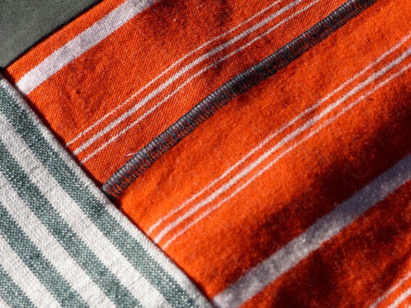 Ik maak over het algemeen tafelkleden van 3 meter lang, die zijn bijna niet te koop. Dit kleed is gemaakt van stof uit de kringloopwinkel, een stuk heb ik gekregen en stof van de markt in Staphorst. De groen gestreepte stof was alleen was niet genoeg voor een tafelkleed van 3 meter lang. Na veel struinen in mijn stoffenvoorraad vond ik de groene stof. Na een tijdje naaien merkte ik al dat het ook niet genoeg was. Toen heb ik de oranje boerenbont erbij genomen. Het zijn twee soorten strepen, smalle en brede. De oranje stof maakt dat het kleed ook vrolijk wordt.